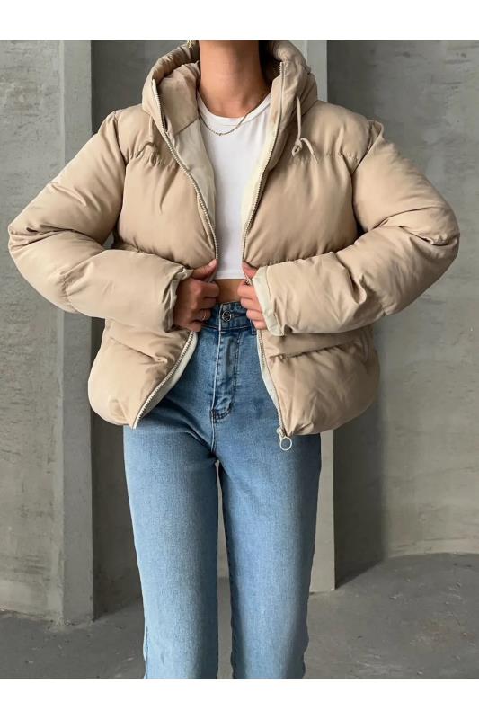 کاپشن پفی کلاهدار مشکی زنانه Ss برند MEECY بژ