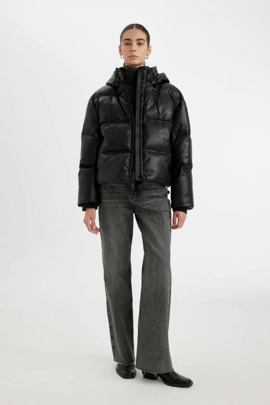 کاپشن چرم مصنوعی دافع آب با جیب زیپ دار از جنس پشم کلاهدار Defacto مشکی