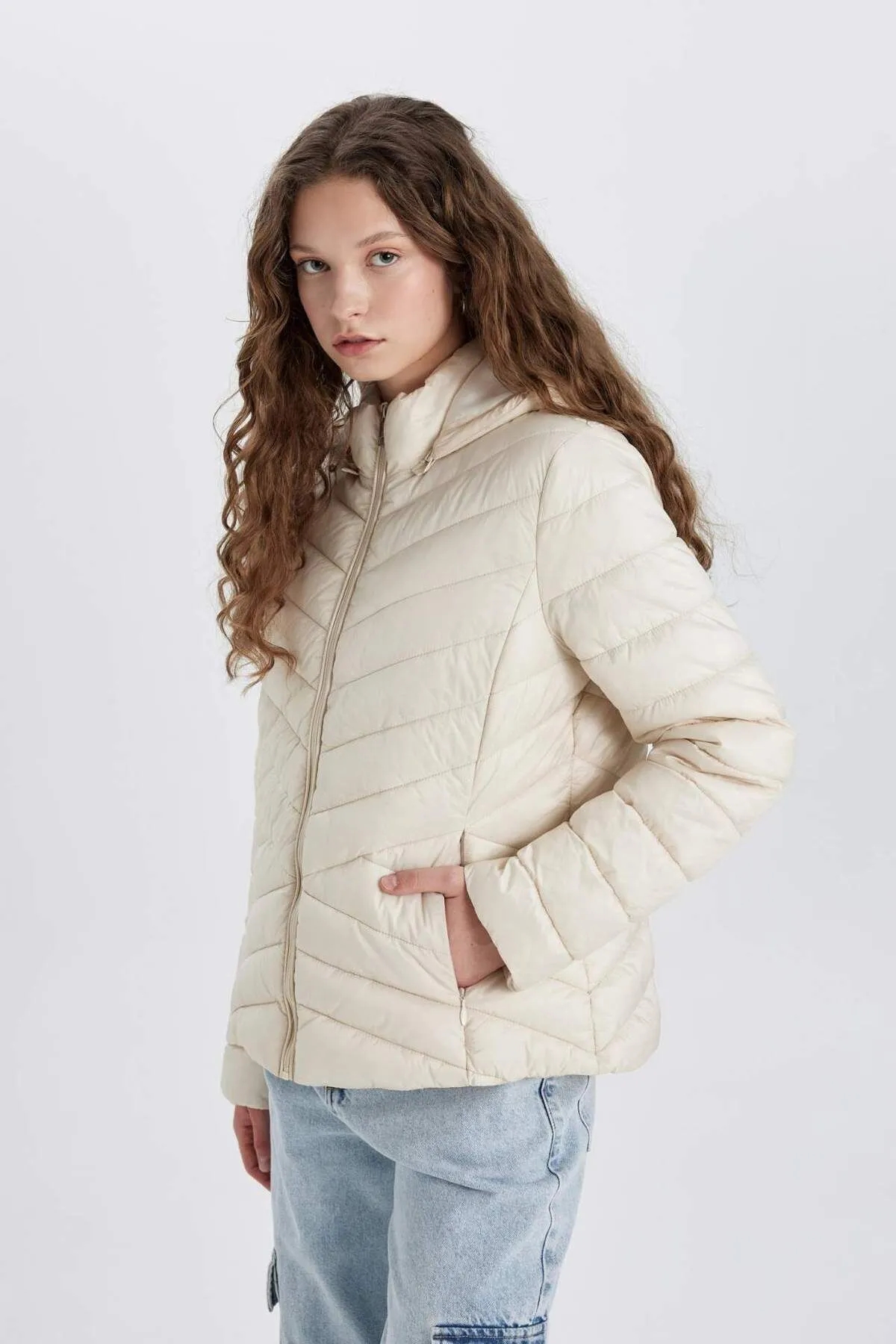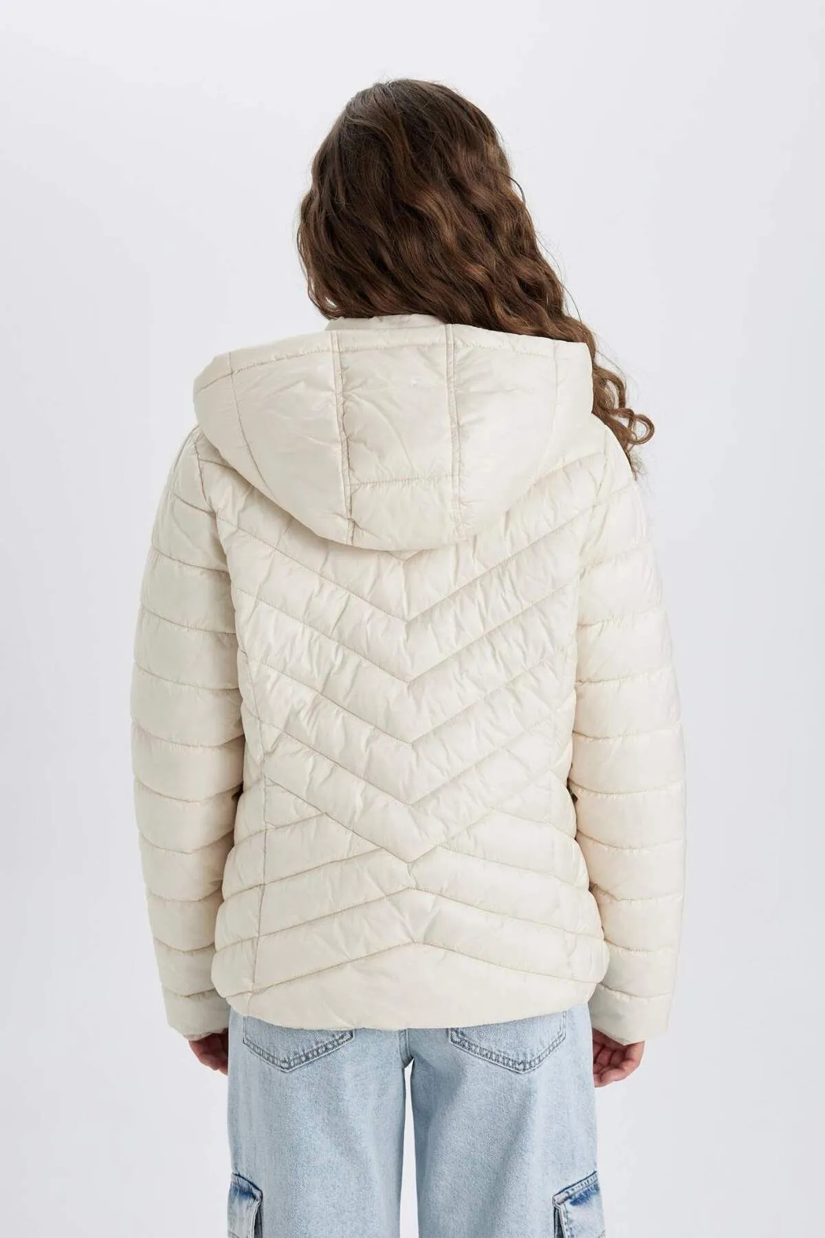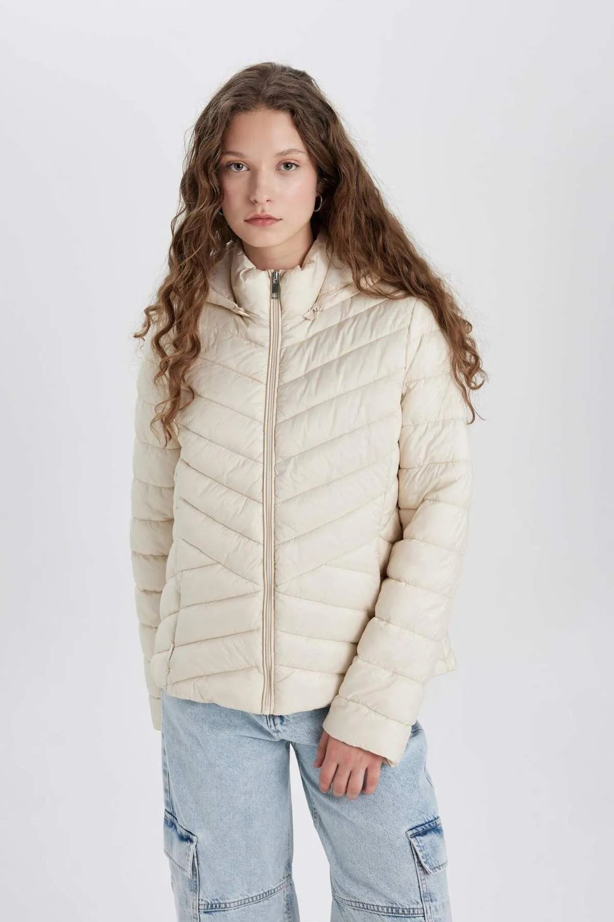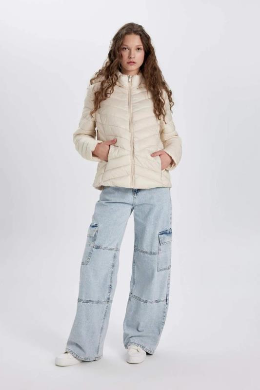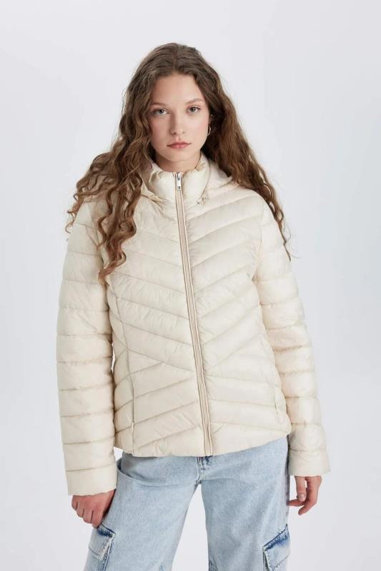 کاپشن پف دار کلاه دار ضد باد معمولی دافع آب Defacto سفید