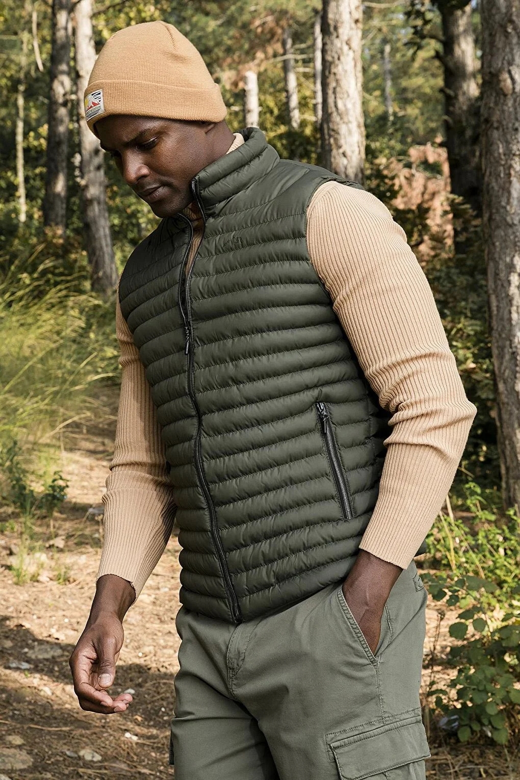 جلیقه پف دار جیبی یقه ایستاده کلاهدار خاکی buratti