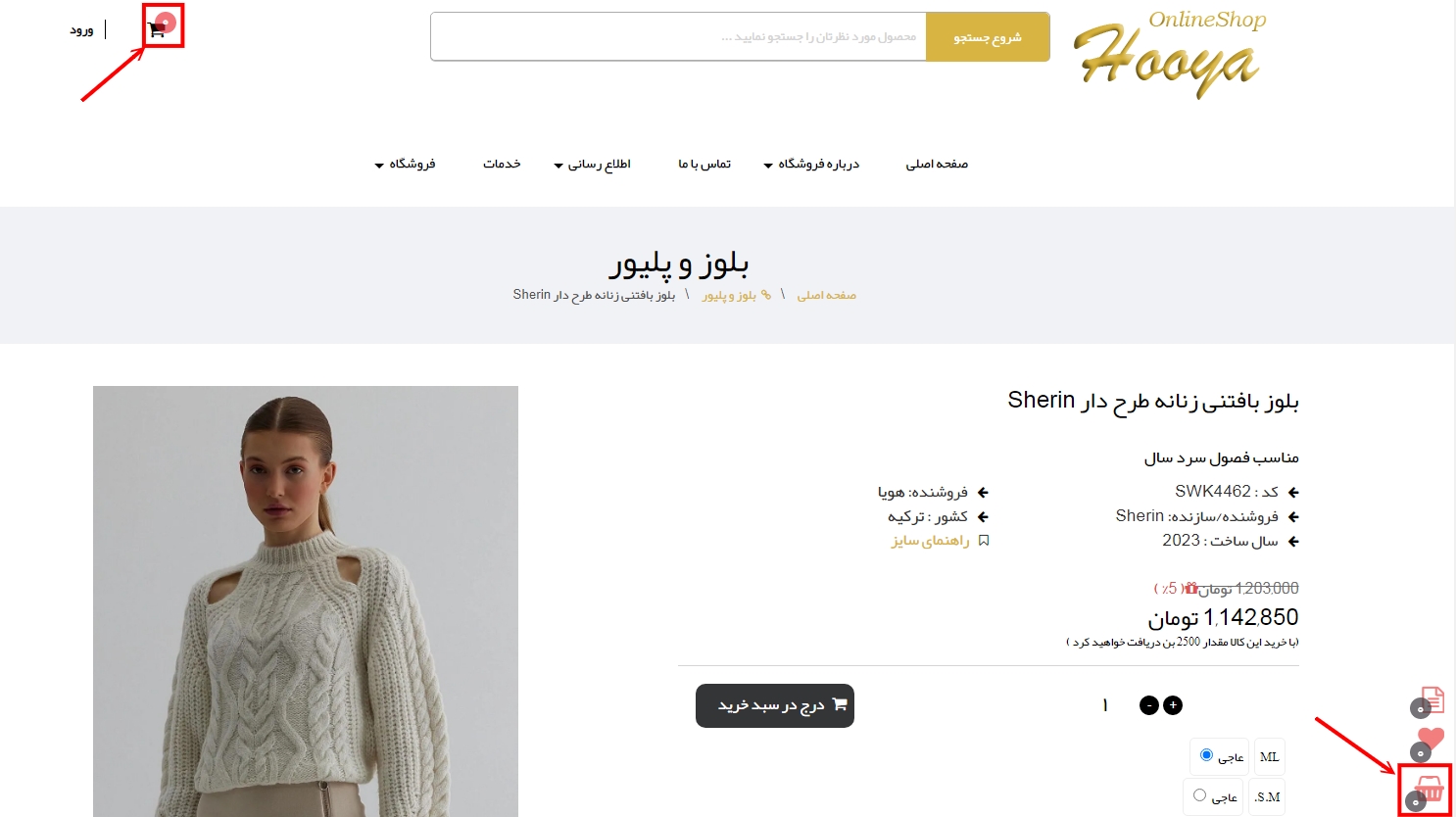 3- در جزئیات کالا ، سایز و رنگ مورد نظر را انتخاب و روی دکمه درج در سبد خرید کلیک می کند تا کالا به سبد خرید مشتری اضافه شود . مشتری می تواند چندین کالا را به سبد خرید خود اضافه نماید .