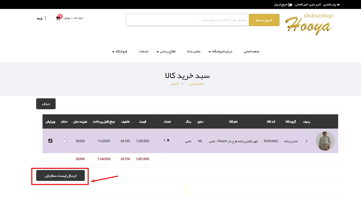 5- مشتری روی دکمه ارسال لیست سفارش در سبد خرید کلیک می کند تا وارد مراحل ثبت سفارش خود شود