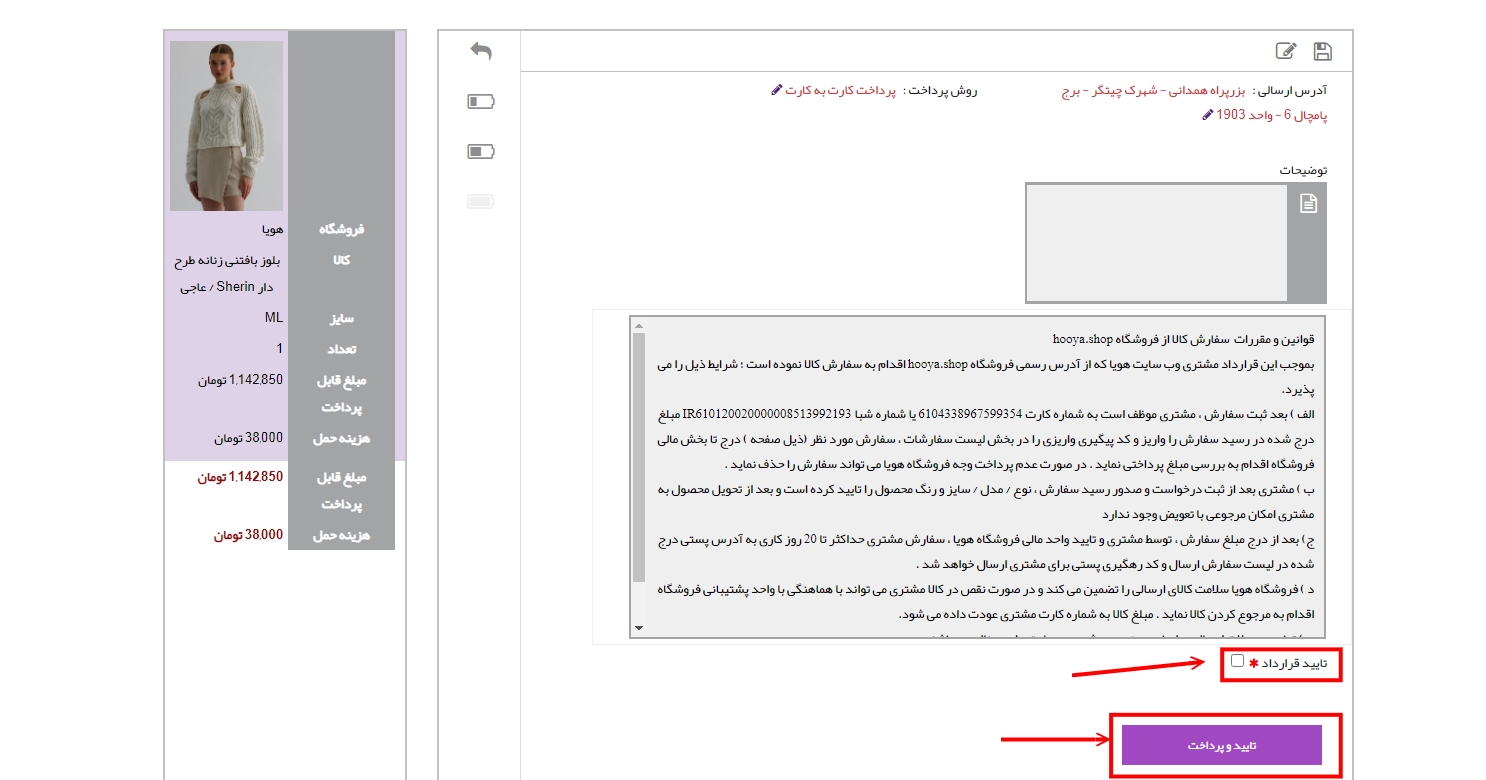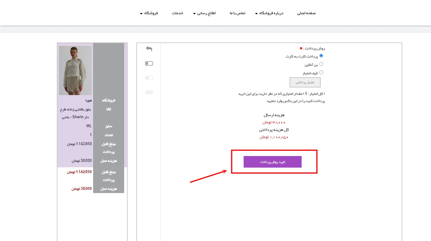 بعد از تعیین روش پرداخت و مشاهده مبلغ کل قابل پرداخت سفارش ، مشتری روی دکمه تایید روش پرداخت کلیک می کند تا وارد مرحله پایانی سفارش شود.
