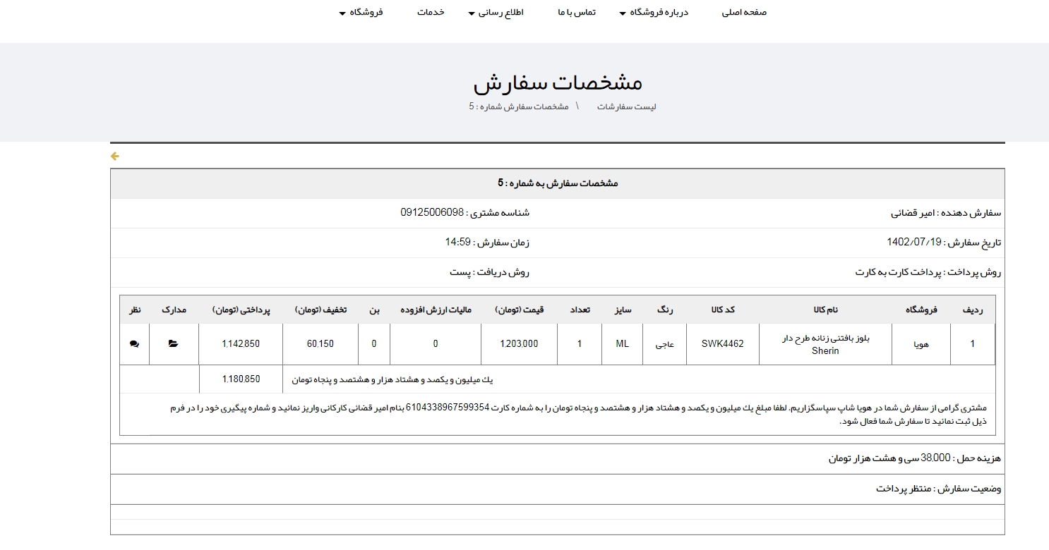 10- بعد از ثبت سفارش برگه سفارش برای شما صادر می شود که شامل مشخصات کامل سفارش شما ، مبلغ قابل پرداخت ، شماره کارتی است که باید پرداخت به آن انجام شود.